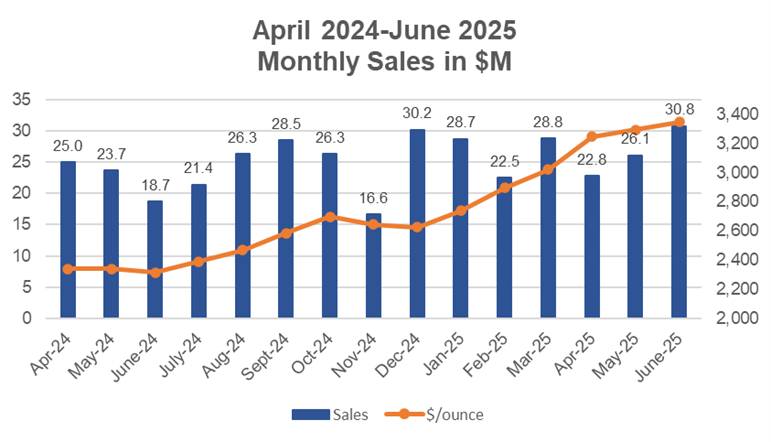 - Las ventas de oro alcanzaron un récord de US$ 30.8 millones (CA$ 42.2 millones) en junio de 2025, en comparación con los US$ 18.7 millones (CA$ 25.6 millones) de junio de 2024.