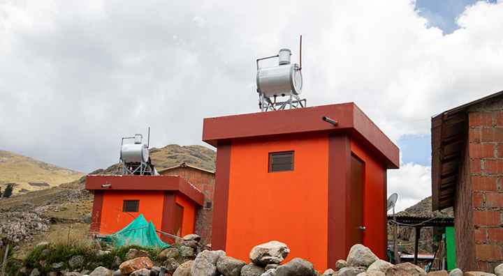 Cada módulo sanitario cuenta con una estructura de concreto armado, e incluye lavatorio de pedestal, inodoro de loza blanca y una zona de ducha revestida con mayólica. Asimismo, se instaló una terma solar para garantizar el acceso a agua caliente, además de cajas de registro, válvulas de ingreso y accesorios técnicos que cumplen estrictamente con las normas peruanas.