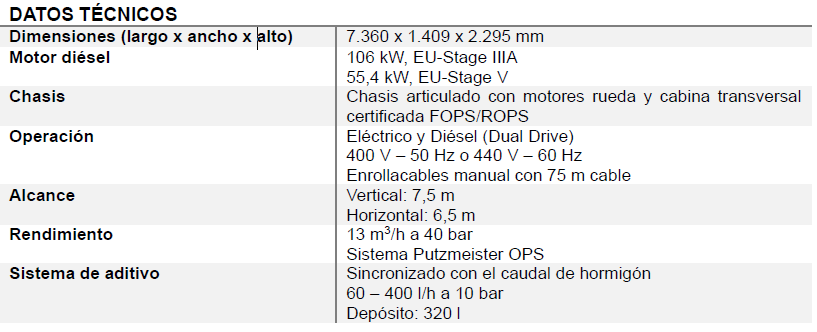 El caudal teórico máximo alcanza los 13 m³/h a 40 bar, lo que lo convierte en una solución ideal para aplicaciones en galerías de dimensiones reducidas. El equipo puede conectarse directamente a la red eléctrica de la mina o funcionar de forma autónoma con su potente motor diésel (Dual Drive). Además, como en otros equipos de la serie Wetkret de Putzmeister, viene equipado con un preciso sistema de sincronización de aditivo con el caudal de hormigón controlado mediante software.