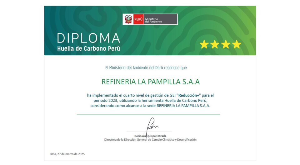 Huella de Carbono Perú, desarrollado por el MINAM, tiene como objetivo fomentar la medición, verificación acreditada y reducción sostenida de las emisiones de GEI en organizaciones públicas y privadas en el Perú. Con esta distinción, Refinería La Pampilla demuestra su compromiso con la sostenibilidad al mantener una reducción constante de sus emisiones, optimizando su indicador de desempeño (inventario GEI versus producción neta).